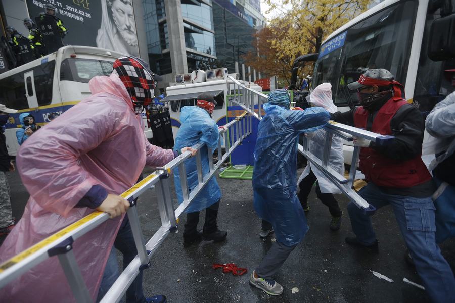 很多示威者高呼“朴槿惠,下台”的口号。示威者在接近总统府时,其中一些人试图冲过警方的警戒线,安全部队施放了催泪弹。目前导致一名示威者重伤,还有多人受伤,并有多人被捕。