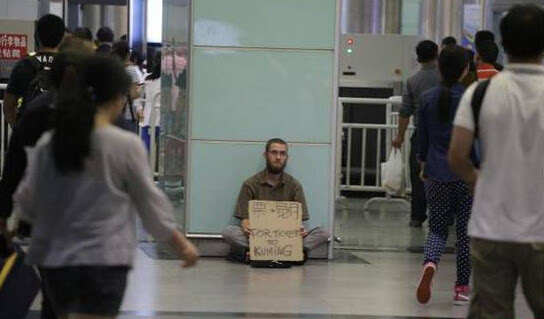咖啡色的平头和络腮胡子,一张写着“票昆明ticketforkunming”的纸皮,让戴着眼镜坐在安检口旁的Victor很容易引起旁人的注意。他自称今年25岁,是波兰人,说着一口流利的英语。他说在这里乞讨是为了筹钱买火车票去昆明,那张火车票价值200元。