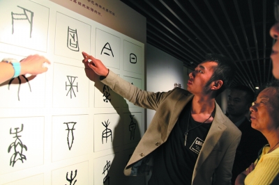 中国古代历法中普遍应用的天干、地支,现在的年轻人已经有些陌生了,而甲骨文中就有十天干和十二地支组合排列成的六十甲子表,对后世影响深远。展览用十根灯柱围成一个圆形,代表十天干,在圆形区域的中心位置用灯光投影展现十二地支,让参观者对天干地支有了基本了解。甲骨从药材到信史资料,从私挖盗掘到科学发掘的命运变迁,是一个复杂的历史进程,展览通过“廉价龙骨”“一字千金”“殷人刀笔”“考释甲骨”“考古探秘”等鲜活的小故事,并配合以模拟场景、甲骨实物,把这段历史娓娓道来。在“学童识字”区,一台触屏机器让孩子们可以轻松摹写甲骨文,将自己的作品打印出来带回家。