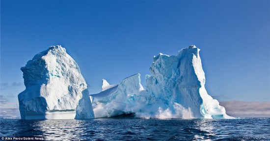 当时,摄影师Alexander Perov正打算拍摄一艘小艇穿越冰山拱洞的照片,结果巨大的冰块突然从冰山上脱离坠落,激起滔天巨浪,让正在附近的小艇急忙快速躲避。