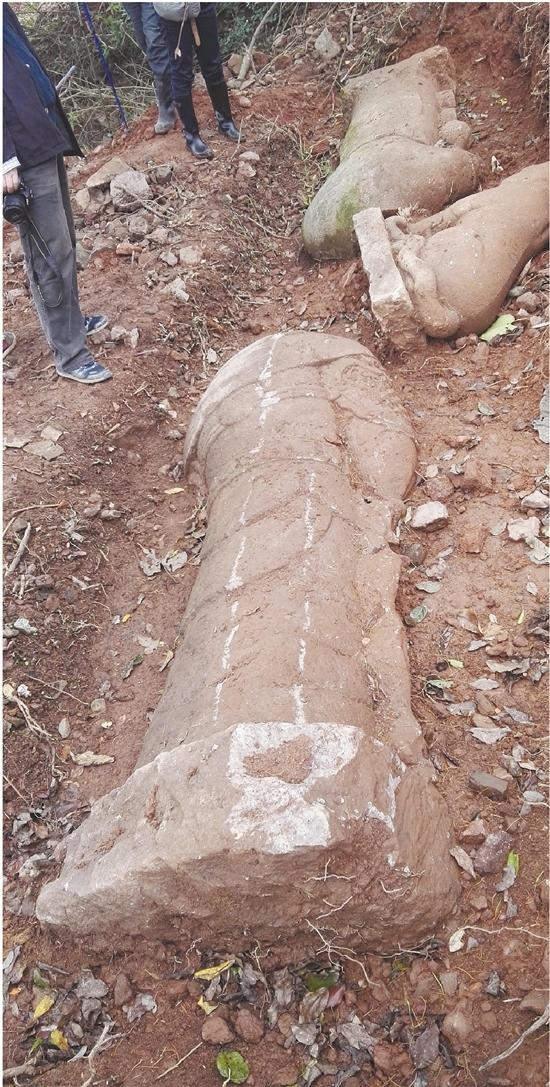 “一般的墓道石刻,顺序都是石羊、石虎、武将文臣依次排列。这次怎么都乱了?石虎掉在石像生边上,本该站着的石像生为什么会倒了……”看到凌乱的石刻,杨古城也皱起了眉头。他望了望四周,主墓室和神道还没发现,应该还在山上,这些石刻很有可能是从墓道掉下来的。而根据附近几个清代墓室都被毛竹覆盖的现状分析,这个墓道很有可能在明代就已荒废。
