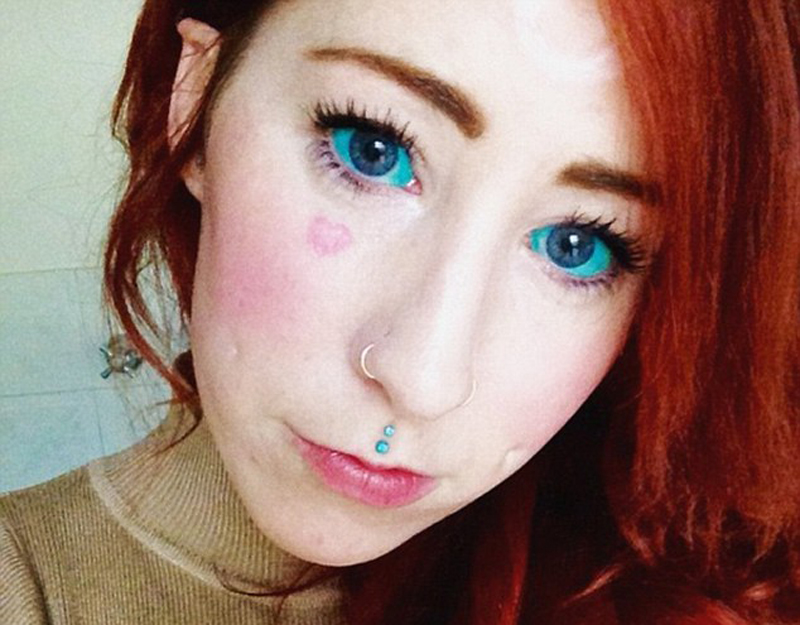 身体穿孔艺术家乔尔特隆(Joeltron)与纳皮尔(Naepier)夫妇分别将眼球染成绿色和紫色。西澳大利亚州的凯莉·加斯(Kylie Garth)的巩膜则被染成了淡蓝色。