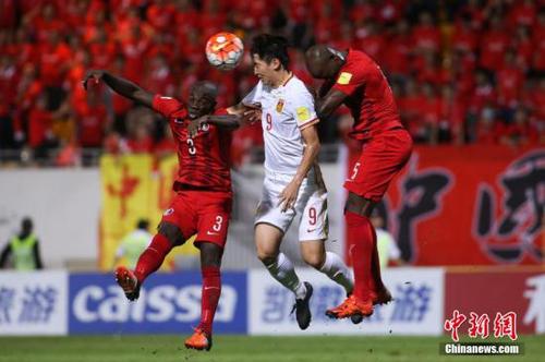 11月17日晚,2018世预赛亚洲区40强赛C组一场焦点之战在香港旺角大球场展开,中国男足客场0:0与中国香港队握手言和。图为杨旭与对手争顶。吴志钊 摄 视觉中国供图