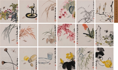 北京保利中国近现代书画部总经理殷华杰向记者指出,此次“十美佳作”的重磅拍品当属齐白石的《叶隐闻声》册?!兑兑派凡峁彩丝醋饔谄氚资绺癯墒炱?,是其花鸟草虫题材中不可多得的精品。最早珍藏在荣宝斋贵宾室中。1994年,荣宝斋拓展香港业务,由著名收藏家霍宗杰购藏其中八开。次年,他又购藏了其余十开。1995年拍摄的《画家齐白石》纪录片中,齐白石的《叶隐闻声》册就已入镜。此次该作品上拍,估价为6000万元。