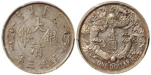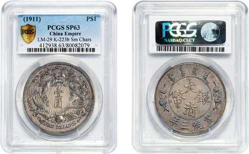“宣统三年大清银币长须龙配普通版壹圆样币”, 1911年度支部天津造币总厂试铸, 未发行, 以普通宣统三年大清银币面, 配长须龙背, 此版别在为数稀少的长须龙样币中, 更为罕见, 此枚刻模深峻, 铸造细致精美, 五彩银光, 版底完美无瑕, 品相殊为难得, PCGS SP63,属经典珍品。