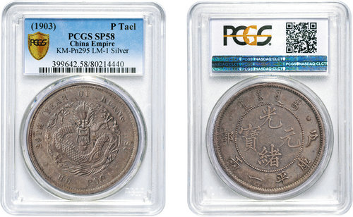 但“29年户部一两银币样币PCGS SP58”以840000RMB成交,仍然为现场带来了激动的气氛。“宣三大清银币“反龙”壹圆样币PCGS SP58”更以330000高价成交,算是本场拍卖的黑马,该拍品150000RMB起拍。