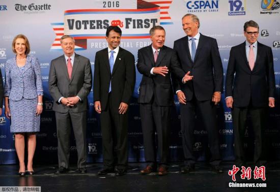 当地时间2015年8月3日,美国新罕布什尔州曼彻斯特,美国前佛州州长杰布·布什,明星医生本杰明·所罗门·卡森,美国新泽西州州长克里斯?克里斯蒂,惠普原CEO卡莉·费奥莉娜,美国参议员林赛·格雷厄姆,美国路易斯安那州州长鲍比·金达尔,美国俄亥俄州州长约翰·卡西奇,纽约州前州长乔治·保陶基,德州前州长里克·佩里,美国前参议员里克·桑托勒姆,威斯康辛州州长斯科特·沃克亮相。首届选民总统论坛在当地举行,11位共和党总统候选人亮相。