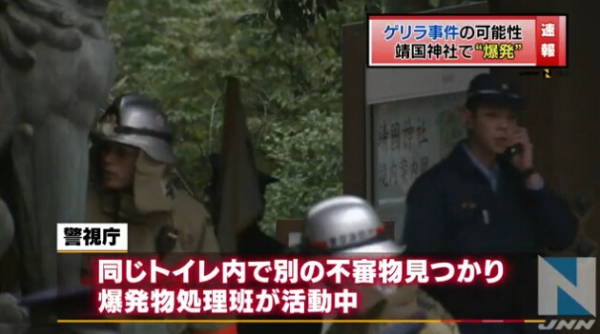据日本电视台11月23肉报道,位于日本东京千代田区的靖国神社23日上午10时左右突然传出爆炸声,来自日本警方的消息称,爆炸现场有两枚爆炸物,其中的一枚发生爆炸,另一枚未引爆。