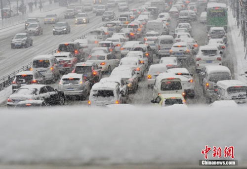 11月24日凌晨,山西太原迎来强降雪天气,市区主要干道结冰打滑,车流缓慢。 中新社记者 韦亮 摄