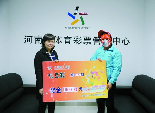 河南体育彩票管理中心书记王海新为七星彩1000万元大奖得主颁奖