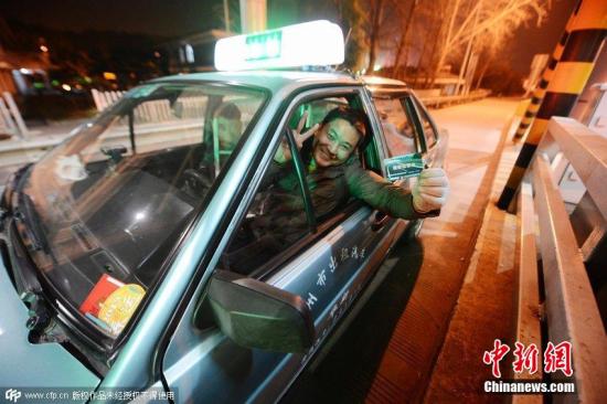 资料图:图为2月17日,江苏省扬州市,一名司机正在开心的展示刚刚领到了临时通行卡。孟德龙 摄