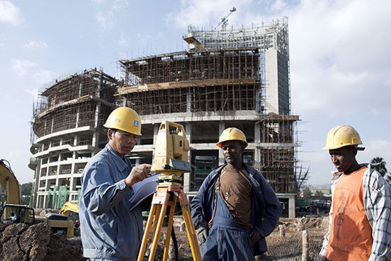 埃塞俄比亚阿迪斯阿贝巴,中国工人与埃塞俄比亚工人在正在建设的非洲联盟大厦上施工