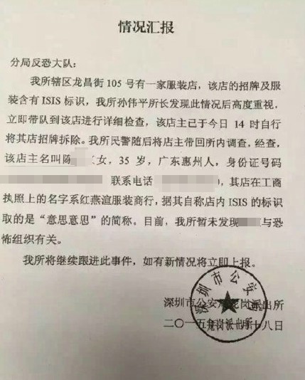 11月26日,一份由深圳市公安局龙岗派出所发给分局反恐大队的《情况汇报》在网上传开。汇报称,该辖区内一家服装店招牌出现ISIS标识,民警经调查,未发现店主与恐怖组织有关。
