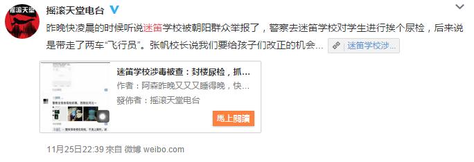 11月25日,有网友爆料称,位于北京市海淀区的迷笛学校被警察突袭尿检,不少学生被警方带走。