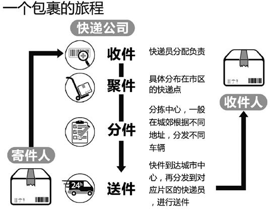 每发出的一件包裹,到达收件人的手上,至少需要经过四个环节,收件、聚件、分件、送件??斓菰卑寻盏胶蠡嵯人偷绞星目斓莘竦?,扫条形码登记。