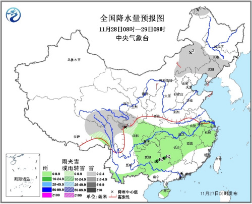 28日08时至29日08时,内蒙古中部和东部偏南地区、黑龙江西北部、吉林南部、辽宁大部、河北北部、青海东南部、西藏东北部、川西高原北部等地有小到中雪或雨夹雪,其中,川西高原北部等地局地有大雪;西藏东南部、西南地区东部、云南南部、江汉南部、江淮西部、江南大部、华南西北部、海南东部等地有小到中雨或阵雨。内蒙古中西部、辽东半岛、山东半岛等地的部分地区有4~6级风。