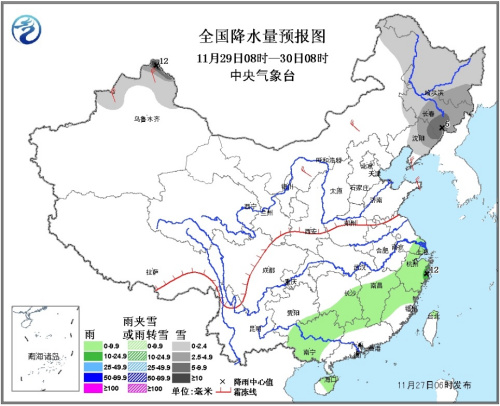 27日08时至28日08时,西藏西部和东北部、青海南部、川西高原北部、新疆南部、黑龙江东北部等地有小到中雪或雨夹雪,其中,青海东南部、川西高原北部等地局地有大雪;西藏东南部、西南地区东部和南部、湖北中南部、湖南中北部、海南东部、台湾东部等地有小到中雨或阵雨。台湾海峡、巴士海峡、南海东北部和中东部海域有6~8级、阵风9级的东北风。