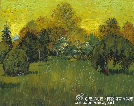 背景远看仿佛是深蓝色的底色,但近看其实是梵高运用了大量深蓝色的短曲线,驻足在画面前欣赏片刻,会有种背景花纹似水波流动的错觉。