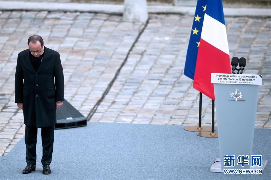 11月27日,在法国巴黎市中心荣军院广场,总统奥朗德主持悼念仪式。法国政府27日在巴黎市中心荣军院广场举行隆重仪式,悼念两周前巴黎系列恐袭事件的130名遇难者。 新华社发(马塞尔摄)