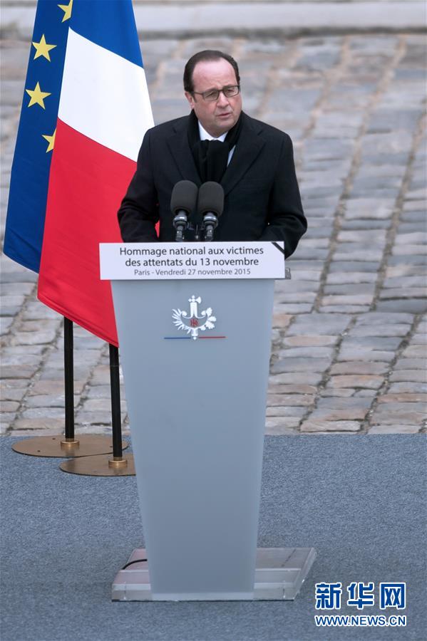 11月27日,在法国巴黎市中心荣军院广场,总统奥朗德主持悼念仪式。法国政府27日在巴黎市中心荣军院广场举行隆重仪式,悼念两周前巴黎系列恐袭事件的130名遇难者。 新华社发(马塞尔摄)