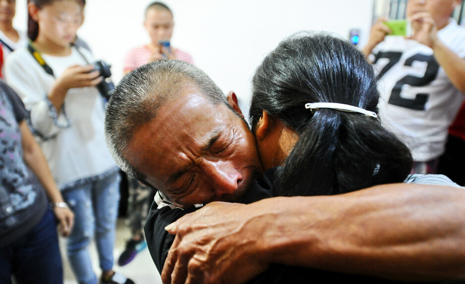 7月5日报道,7月3日,贵州贵阳,湖南女子李艳红11年前被拐嫁与贵阳市息烽县男子,11年后终于与家人团聚。李艳红,29岁,娘家是湖南邵阳人,有智力障碍,11年前被拐卖到广东。9年前在一个手套厂,和息烽人邬忠国相识相恋,并回到了息烽生活,生下一对双胞胎。远在湖南的亲人,通过宝贝回家寻子网找到了女儿,一家人从湖南赶赴贵州认亲。阔别11年后,一家人终于团聚。图为六旬老人李祖明与失散11年的女儿抱头痛哭。