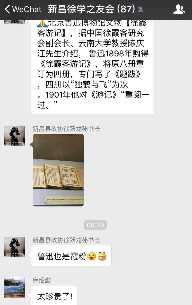 11月4日,新昌政协城资环委旅游组考察徐霞客游线新昌段,拟提出?;だ眯煜伎陀蜗弑曛镜刈ㄏ罱ㄒ?。新昌县政协秘书长徐跃龙作为办公室主要联络人,一直在积极参与、推动新昌有关徐霞客标志地认证工作,并且积极在当地弘扬徐霞客精神?!靶虏煅е鸦帷钡奈⑿湃褐?,群友每天利用闲暇时间分享、探讨有关徐霞客游线标志地相关工作的最新动向。