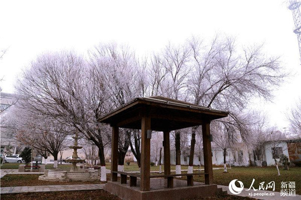 11月30日,新疆多地出现雾凇美景。在新疆博湖县整座小城都笼罩在玉树银花的世界里,煞是好看,为寒冷的冬季增添了童话色彩。