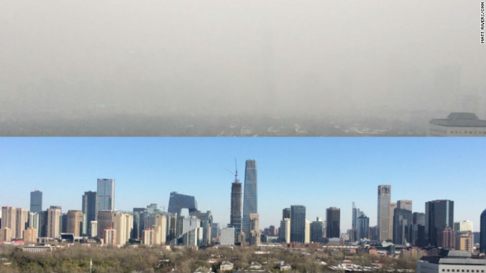 CNN北京办事处所在地27日拍摄照片(上图)和26日拍摄照片(下图)对比。雾霾袭城仅用了一天时间。