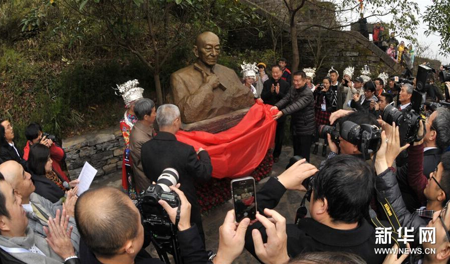 当日,围棋大师吴清源铜像在位于湖南湘西凤凰古城的中国南方长城揭幕。吴清源1914年出生于福建省福州市,2014年11月30日在日本去世,享年100岁,其提出的“新布局”理论奠定了现代围棋基础。(新华社记者 龙弘涛 摄)