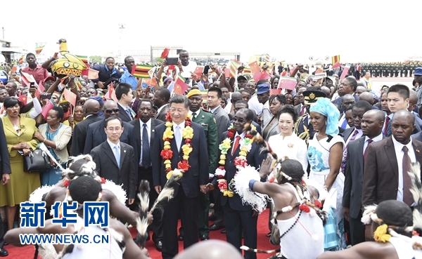 当地时间上午10时15分许,习近平乘坐的专机抵达哈拉雷国际机场。习近平和夫人彭丽媛步出舱门。津巴布韦总统穆加贝夫妇、副总统姆南加古瓦、副总统穆波科、外长蒙本盖圭等在机场迎接,并来到舷梯前同习近平和彭丽媛热情握手,热烈欢迎习近平到访。