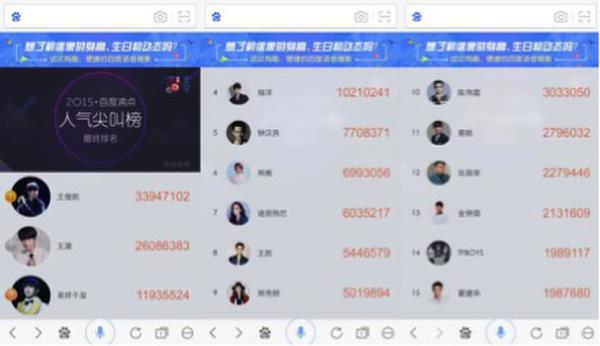 “2015百度沸点明星榜”第一阶段“百度沸点人气尖叫榜”最终排名情况