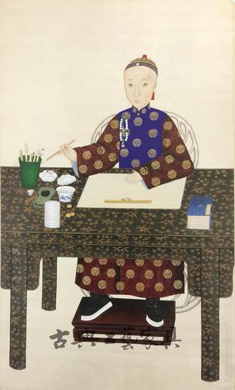 图中年轻的同治帝身着便服,手持毛笔,伏案写字?;械穆菇且巍⒑谄崦杞鹱?、文房用具、红木脚踏等,反映了晚清宫廷的陈设。值得注意的是,同治帝右肩下挂着珍珠手串,手串上还配有翠玉、碧玺。