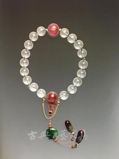 清宫旧藏。水晶珠18颗,粉色碧玺结珠与佛头。背云为椭圆形扁平翠片。坠角为镀金钟形件嵌红宝石。水晶珠串呈现出通透明净的气质,而碧玺结珠与佛头、翠绿的背云片与红宝石的坠角显示出华美的气派。