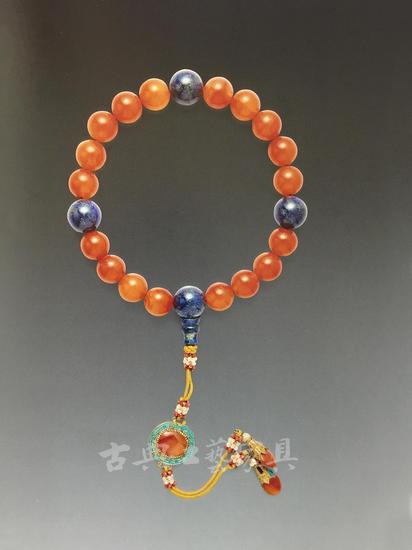 长31cm,手串直径12cm,清宫旧藏。手串共红玛瑙十八颗,青金石结珠三颗。青金石佛头及佛头塔装饰以珊瑚珠与米珠。背云为点翠椭圆牌,中央镶嵌椭圆形红玛瑙一块,其下装饰珊瑚珠与米珠。坠角为镀金钟形嵌件,嵌镶红玛瑙两颗,其上装饰小珍珠一粒,也体现了匠师们高超的工艺水平。