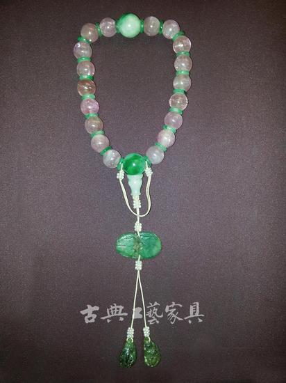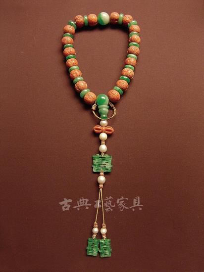一般而言,清代女子佩带手串,穿对襟衣时,挂在第二颗纽扣上;穿大褂衣时,则挂在腋上方的襟钮上,也可挽在手腕或握于手中。玉石质地的手串多由翡翠、红宝石、水晶等制成圆珠,选一精致的坠角系在上端,戴在衣襟扣上。手串与坠角呈下垂状。当然也有沉香、紫檀等珍贵木料质地,总体而言,根据服装颜色选择合适、鲜明的手串佩戴,既增加美感,又体现富贵。