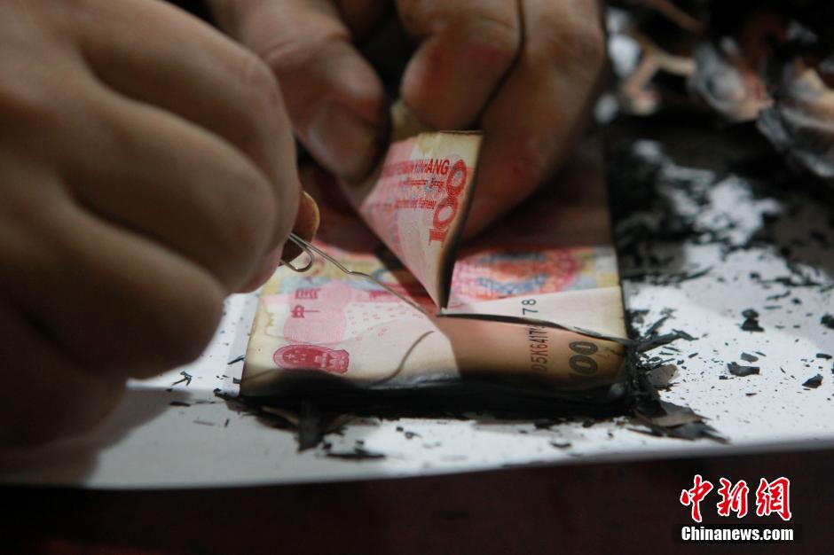 负责残币兑换的专家刘铁峰用曲别针一张一张挑开残币,进行鉴定和修复工作,尽量使老夫妻二人能够减少火灾的损失。 图片来源:视觉中国