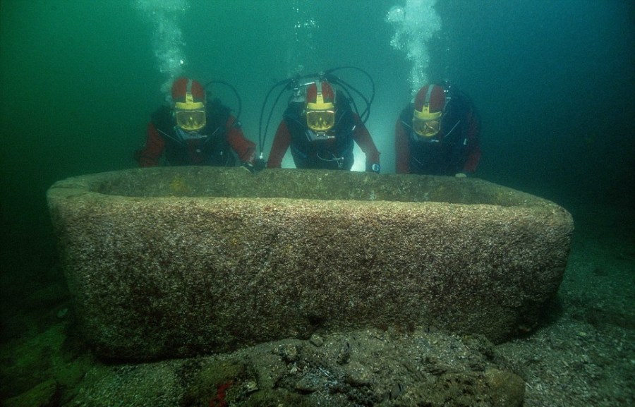 潜水员们在赫拉克利翁泥沙废墟中发现这个粉色花岗岩雕刻而成的花园大缸。(网页截图)