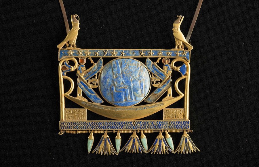 这条项链又被称为胸饰,它由青金石和玻璃组成,这件文物将从埃及博物馆借出,在大英博物馆展出。这条项链可追溯到公元前940年,属法老王舍??硕?Sheshonk II)所有。(网页截图)