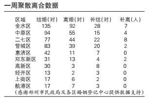 上周,一场暴雪让郑州市各区的婚姻登记遇“冷”,领结婚证的、领离婚证的都少了,其中,郑州市各区共有539对新人办理结婚登记手续,比前一周减少337对;272对夫妇离婚,比前一周减少100对。此外,还有112对夫妇补领结婚证,23人补领离婚证。