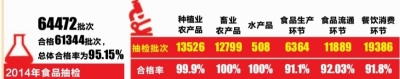 2014年,执法人员在全市食品生产企业、小作坊开展监督抽检时,不合格检出率较高的是豆制品、桶装水和白酒。