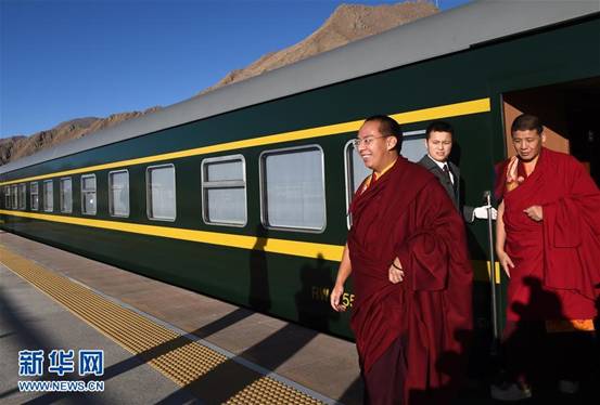 12月1日,班禅额尔德尼·确吉杰布乘火车去日喀则途中在曲水县火车站下车短暂休息。当日,班禅额尔德尼·确吉杰布在结束拉萨的社会活动和佛事活动之后,从拉萨乘火车到达日喀则市扎什伦布寺,这是班禅额尔德尼·确吉杰布历史上第一次乘火车回到扎什伦布寺。拉萨至日喀则市火车于2014年8月15日开通,截至目前运送旅客约80万人次。新华社记者 觉果 摄