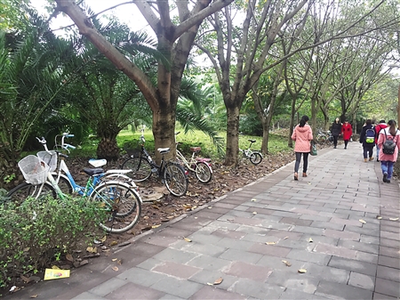 该校安全部一名工作人员介绍,“最初,那块空地没有铺水泥,可能学生们觉得停车不方便,所以从上学期开始,学校就着手修建停车场?!比煌3党≌浇ǔ珊?,乱停自行车的现象还是很严重。