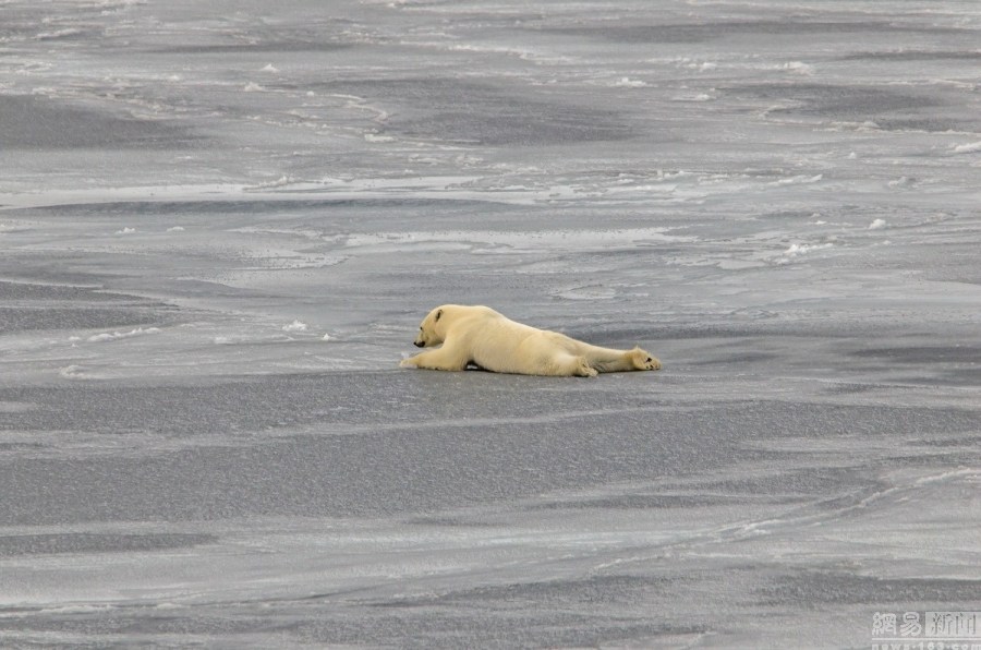 一头北极熊因为冰面太滑,屡次滑到在地,尽管它试图压低身子让自己不会跌倒,可是依旧躲不过跌倒的命运。
