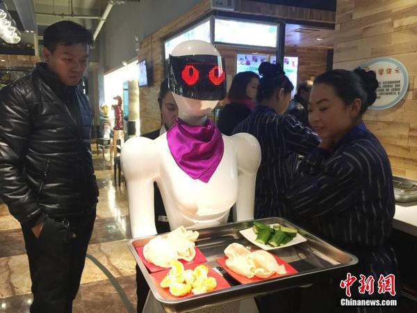 12月4日,兰州一餐厅用机器人装扮成的女服务员服务顾客引围观。杨艳敏 摄