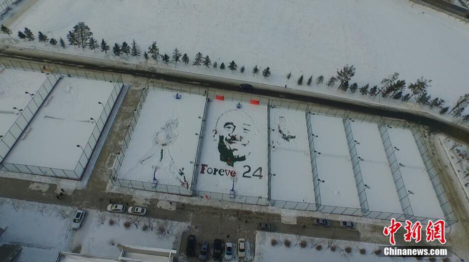 2015年12月6日,吉林省吉林市北华大学的学生在操场上用积雪“画”出即将退役的NBA篮球巨型科比肖像。制作从上午9时开始,持续了4个小时。参与制作的大学生使用扫把、戳子、塑料桶等工具,扫除部分积雪,留下巨型科比的肖像。 图片来源:视觉中国