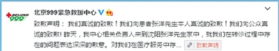 昨晚,999急救中心官方微博发布声明,向张先生致歉。网络截图