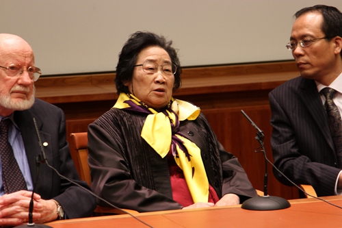 刚刚落座的屠呦呦显得很疲倦,但回答了几个问题后,就恢复了精神。现场记者明显对她充满好奇,大多数人都会向她提问,翻译不断轻拍她的手臂提醒她慢点回答,她还倔强地推开他的手。