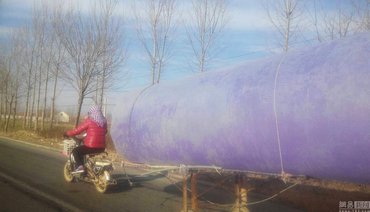 2015年12月6日,在山东东营市利津县一村庄,一位村民骑着电动车,拉着灌满天然气的6米长“巨型塑料袋”,带回家生火做饭,路人见此情景为其捏冷汗。据了解,村民将塑料袋灌天然气带回家做饭存在很大的安全隐患。东方IC供图。