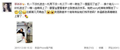 照片中,李冰冰躺在床上面容憔悴,已经烧至39.7度,左手还插着输液管,白色的床单上留有明显的血迹。手上已经出现淤青,看上去很虚弱。