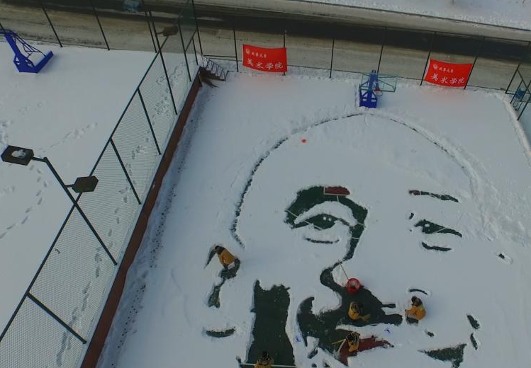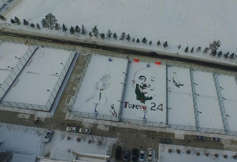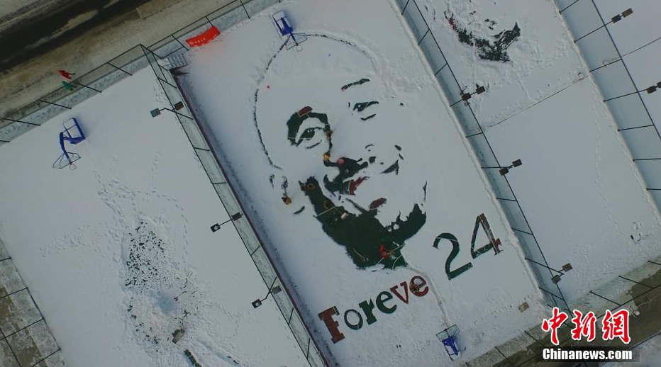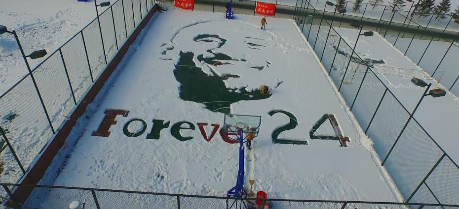 2015年12月6日,吉林省吉林市北华大学的学生在操场上用积雪“画”出即将退役的NBA篮球巨型科比肖像。制作从上午9时开始,持续了4个小时。参与制作的大学生使用扫把、戳子、塑料桶等工具,扫除部分积雪,留下巨型科比的肖像。